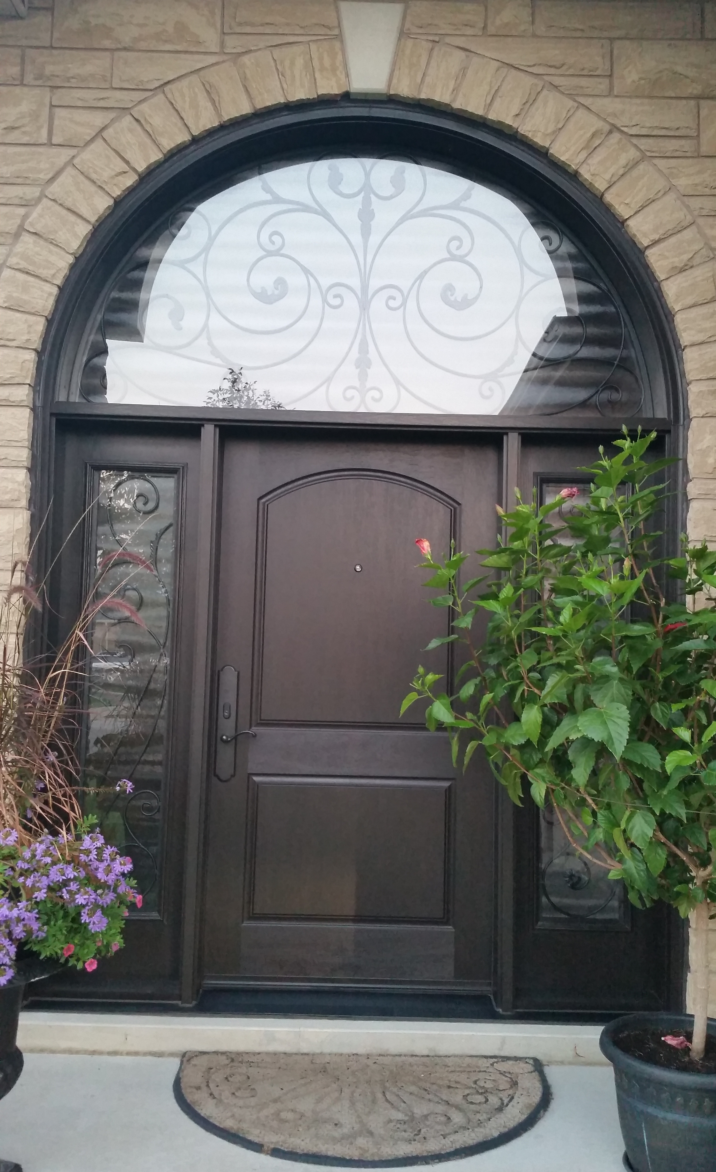 Arched Mastergrain Fiberglass 2 Panel with Custom Wrough Iron Sidelites