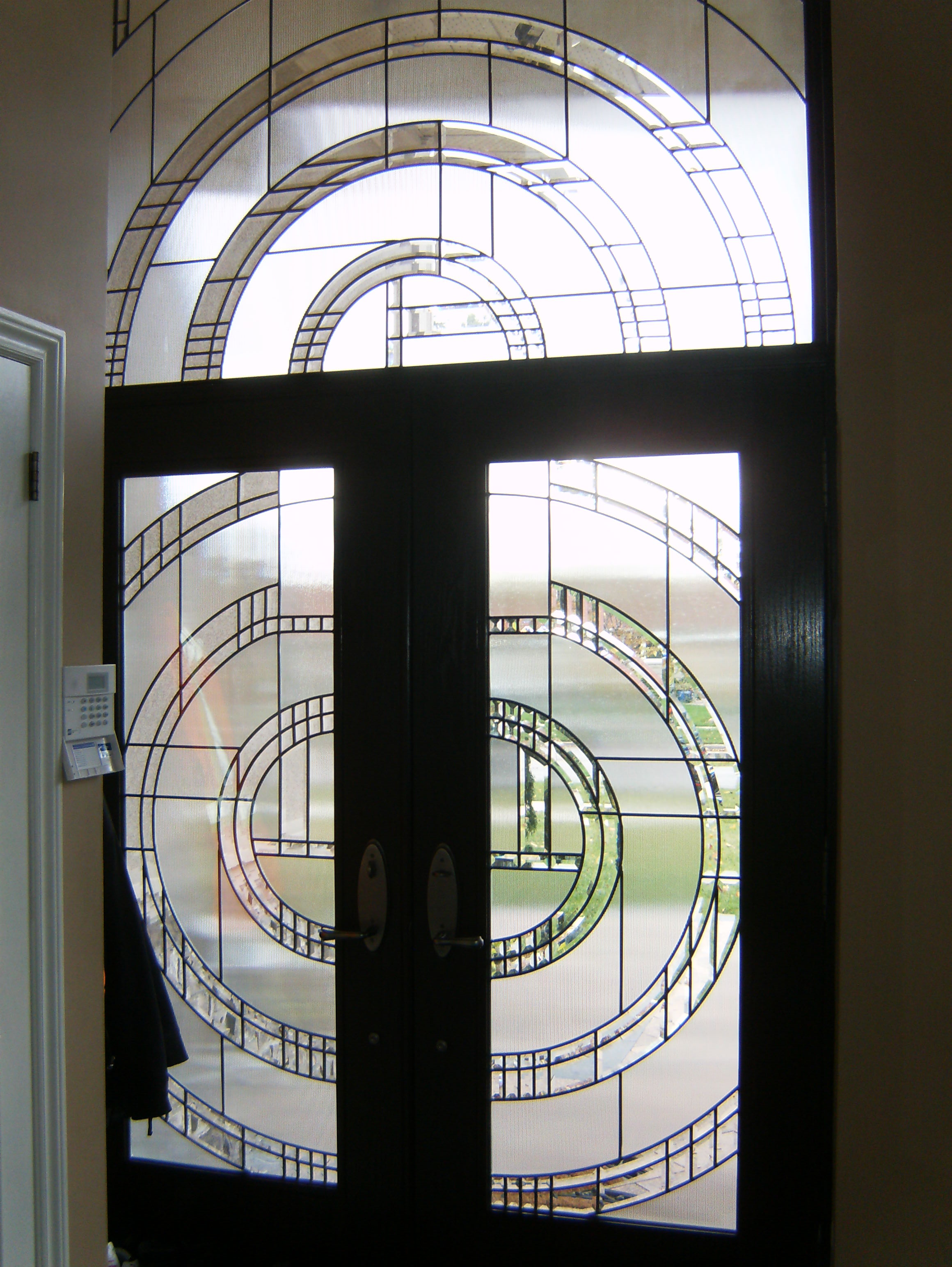 Custom 8ft Mastergrain door with 2 sidelites and transom sidelites with sandblasted leaded glass in Mocha colour