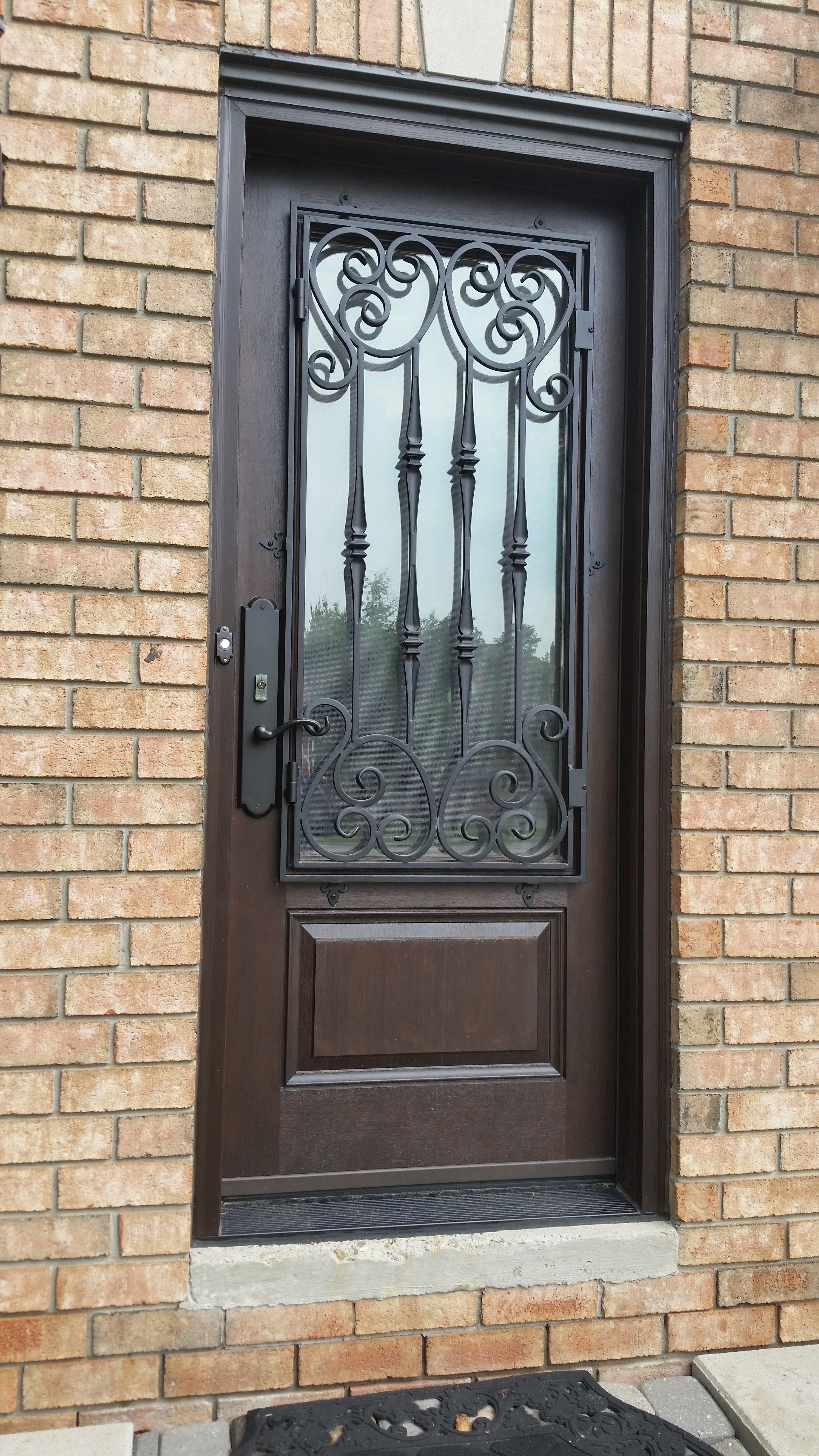 Custom Mastergrain Fiberglass door with Miliano Millenia Wrought iron Design